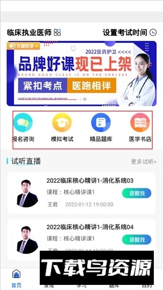 3、首页设有报名咨询、模拟考试、精品题库等核心功能的入口;