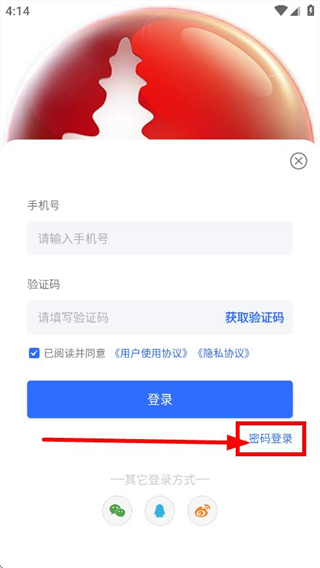 3、进入登录页面后,找到并点击“密码登录”选项,即可切换至密码登录界面。