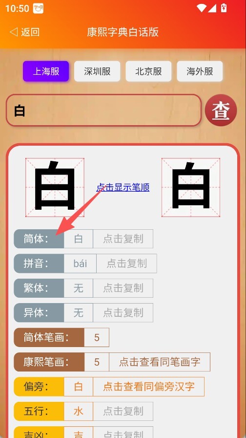 3、点击单个汉字,即可查看该字的简体形式、拼音等详细信息。