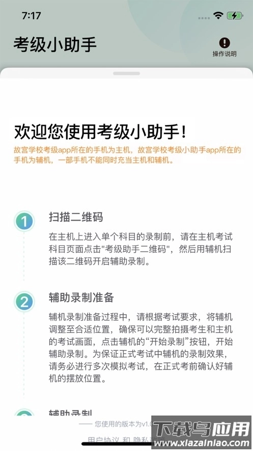这款应用的核心功能在于辅助完成在线视频考级过程中的双机位监控流程。