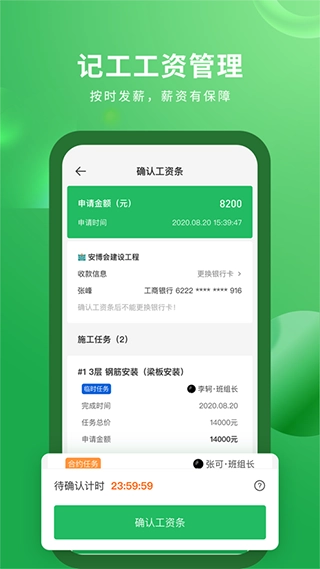 5、针对企业、班组长与建筑工人的差异化需求进行量身定制,为各方提供科学、实用且高效的互联网解决方案,是目前唯一可打通专账支付渠道、实现工人薪酬闭环的软件。