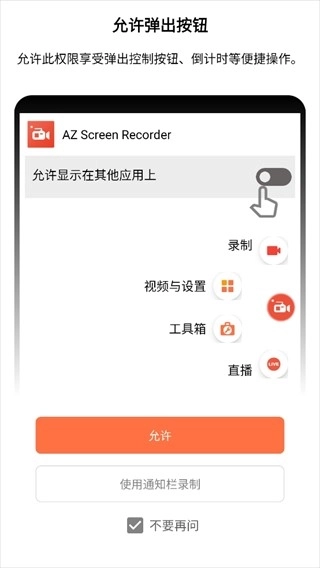 1、打开软件前需先授予该权限,以使用弹出控制按钮、倒计时等便捷功能