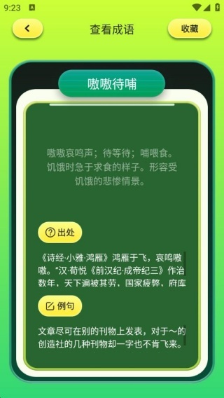 4、既能查看释义,也能查看出处和例句,还可一键收藏成语,使用十分便捷。