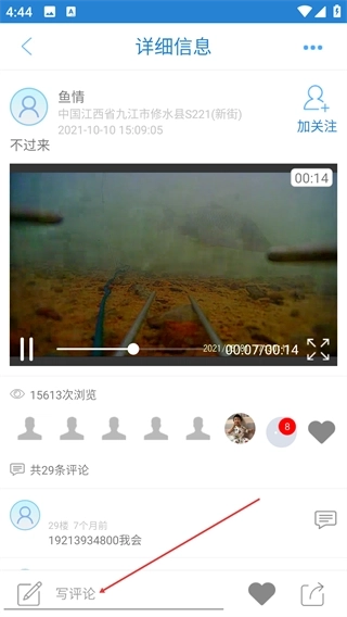 4、视频播放时,可通过进度条调整播放进度,还能点击【写评论】按钮,对该视频发布评论进行互动。