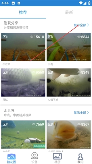 1、进入【拍友圈】页面,可查看【渔获分享】【水世界】等分类内容,点击分类旁【显示全部】可查看该分类下的完整内容。