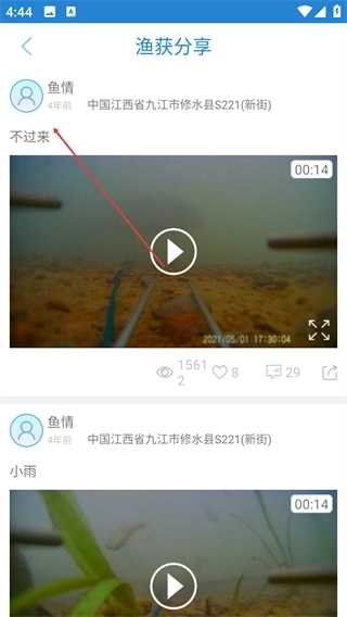 2、在【渔获分享】分类页,点击目标视频(如“不过来”),即可进入该视频的列表详情页,查看视频及相关互动数据。