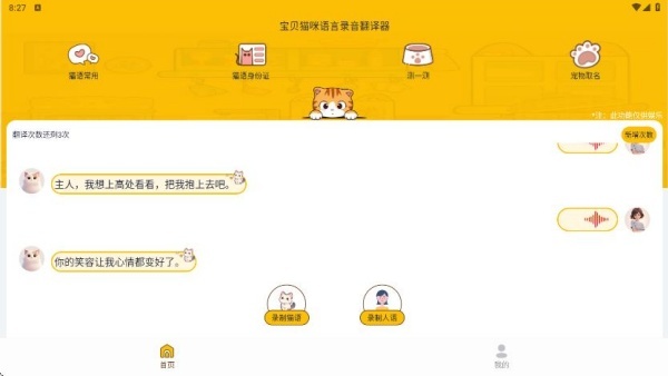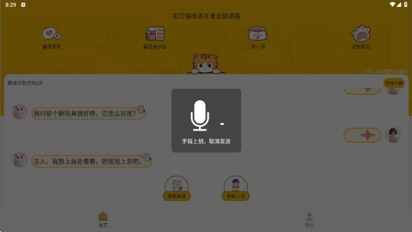 首页包含猫语常用、猫语身份证、测一测、宠物取名等功能模块,同时支持录制猫语与人声并进行同步翻译。