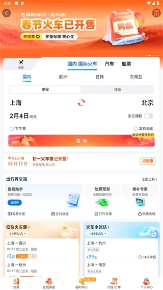 携程火车票是一款便捷的火车票预订服务软件,涵盖高铁、动车、普通列车及国际火车票等服务类型。其核心功能丰富,包括实时票位查询、快速抢票、在线选座、中转换乘规划,以及灵活度极高的退改签服务。此外,软件依托大数据和携程自身优势,为用户提供高效的出行解决方案,同时支持多种支付方式,让用户能快捷方便地购票,享受沉浸式的优质服务体验。
