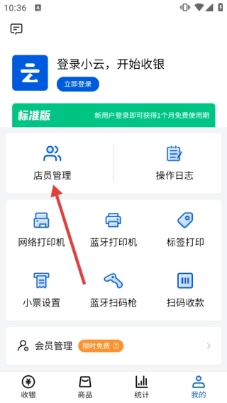 2、进入个人中心后,选择【店员管理】选项,页面会跳转到小云收银的登录界面。