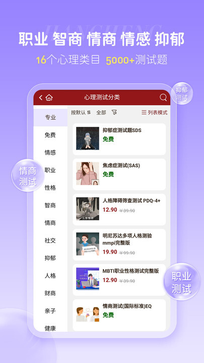 2、涵盖职业、智商、情商、情感、抑郁等16个心理类目,包含5000多道测试题。