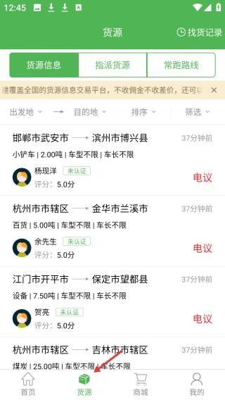 2、进入货源页面后,会展示出发地、目的地等货源详情,同时设有指派货源等分类板块,方便司机更快捷地查找合适货源。