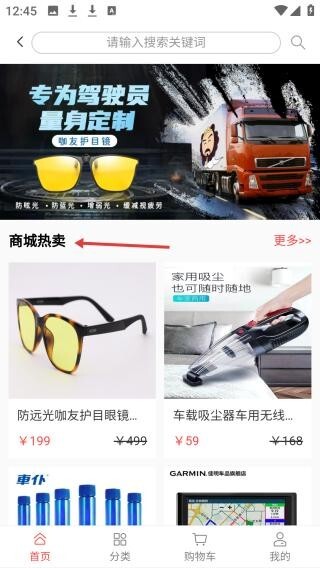 3、在商城界面中,可点击专为驾驶员打造的定制商品,其中包含护目眼镜等品类;此外还有家用商品可供选择,该界面还设有分类、购物车等实用功能。