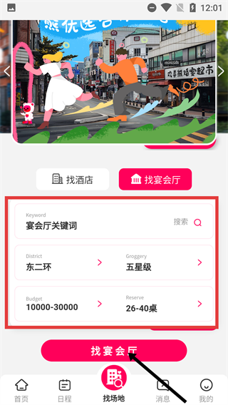 1、进入“找场地”页面后,可设置宴会厅关键词、所在区域、等级、预算范围、所需桌数等筛选条件,随后点击【找宴会厅】按钮,即可得到符合条件的场地推荐列表。
