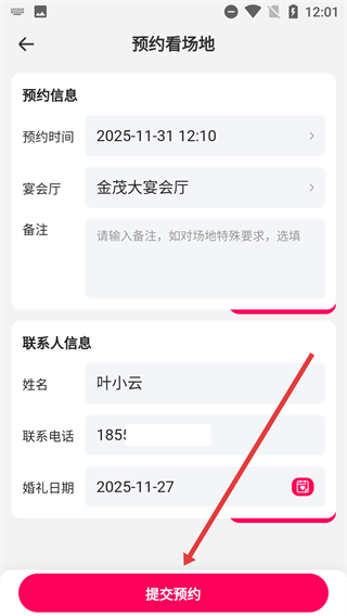 4、进入预约看场地页面后,先确认预约时间、宴会厅等相关信息,再补充完整联系人信息,最后点击【提交预约】按钮,即可完成看场地的预约流程。