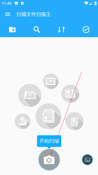 1、在扫描文件扫描王页面,点击底部的相机图标,即可进入扫描操作界面。
