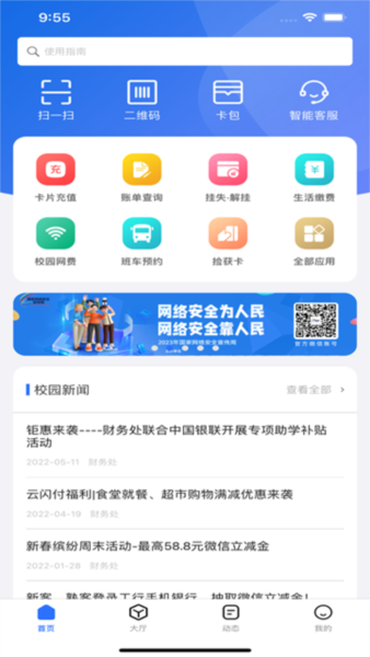 1、校园卡全功能管理:充值、消费查询、挂失解挂等一站式服务