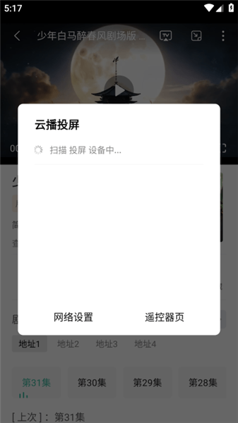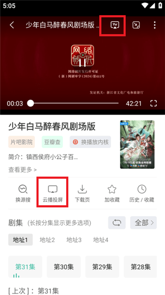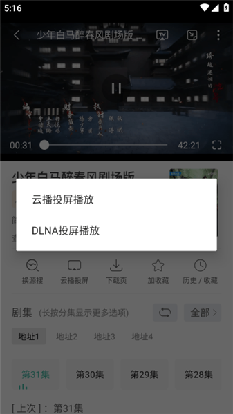 随便打开一部影视片,你会发现这里有两个投屏功能:上方的可以选择两种投屏方式,下方则直接是云播投屏。