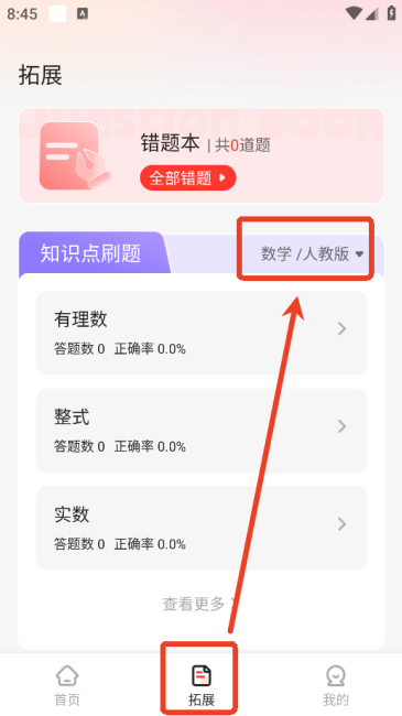 1.打开软件后,在【拓展】板块中点击箭头指示的位置,即可切换教材版本。