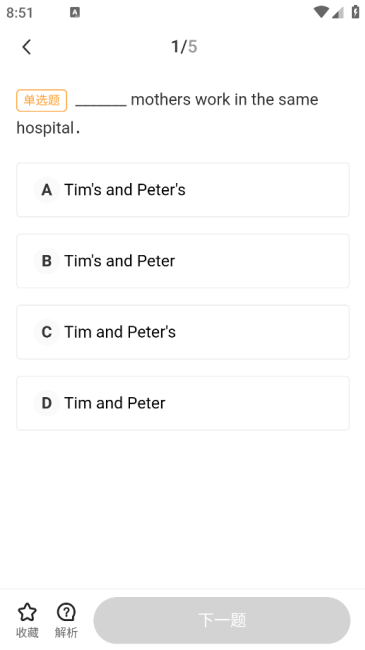 4.点击题库后就能开始练题,此外还提供了收藏和解析功能