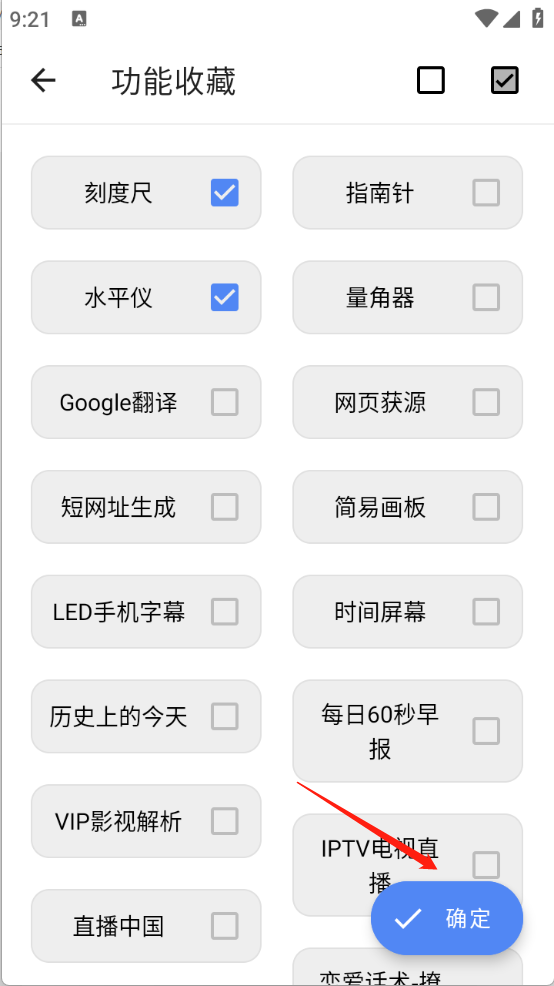 2、勾选想要添加收藏的工具,点击“确定”。