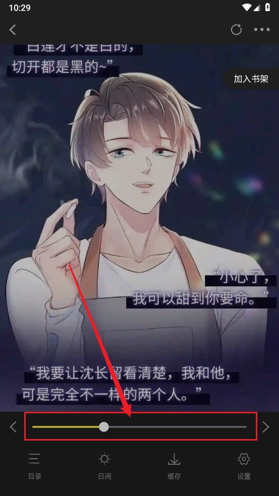 在漫画界面点击中间区域呼出菜单,点击"夜间"。