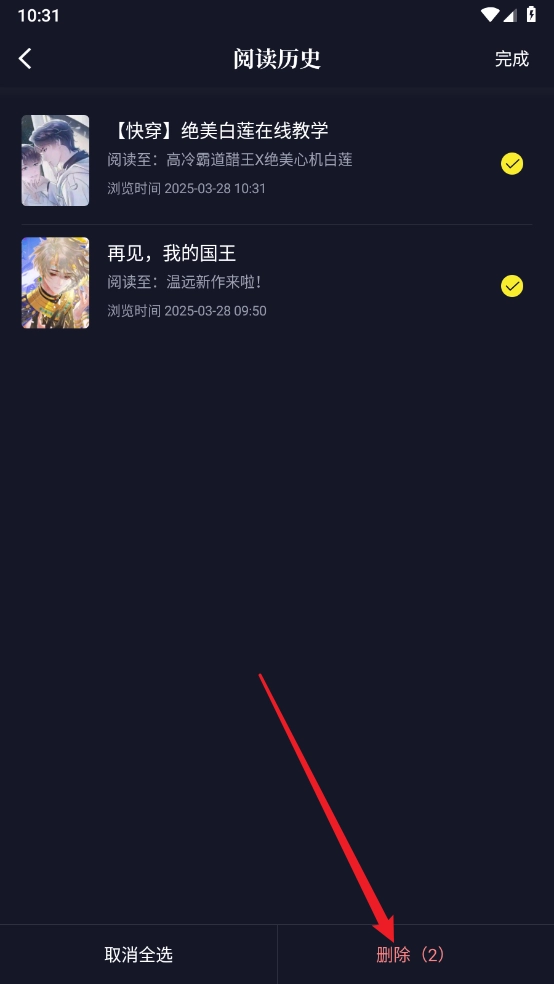 选择所需删除的历史阅读,点击"删除"即可。