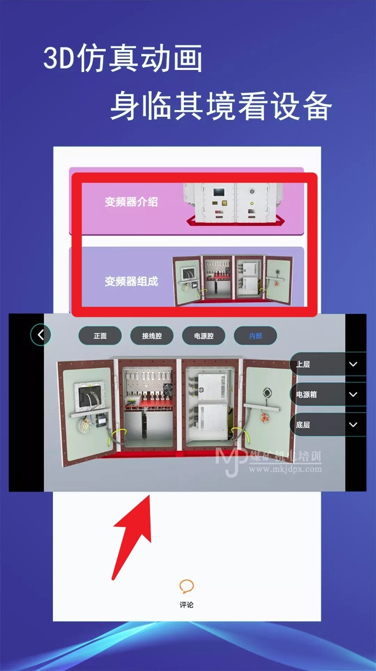 3. 进入3D仿真动画界面后,轻点不同的部位标签就能查看设备的内部结构,拖动视角还可以从多个角度进行学习。