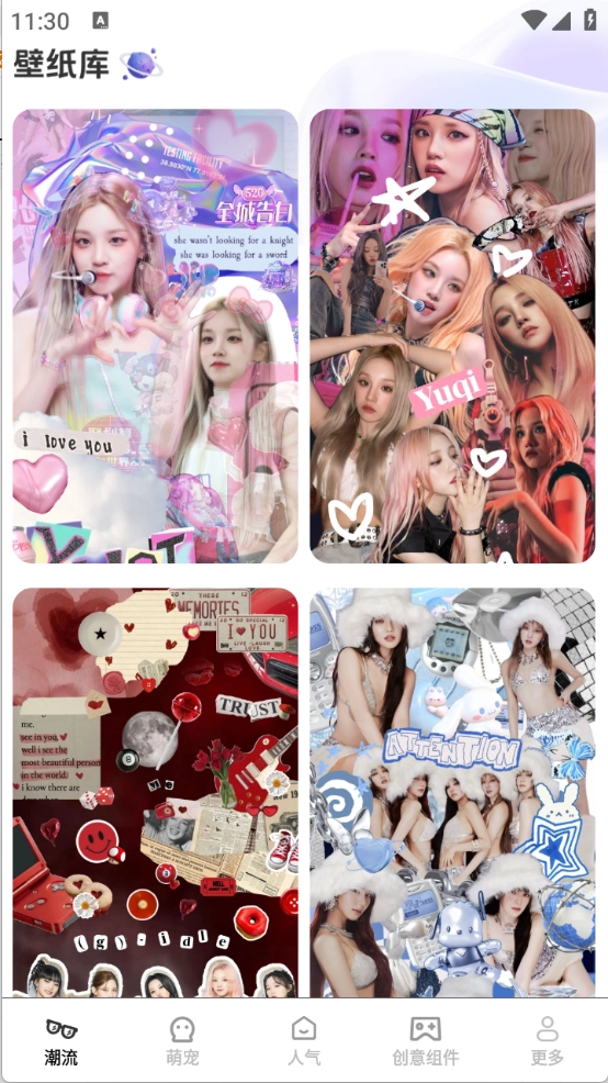 进入首页后,顶部栏里集合了各式各样的壁纸类型,像潮流、人气、萌宠之类的都有。