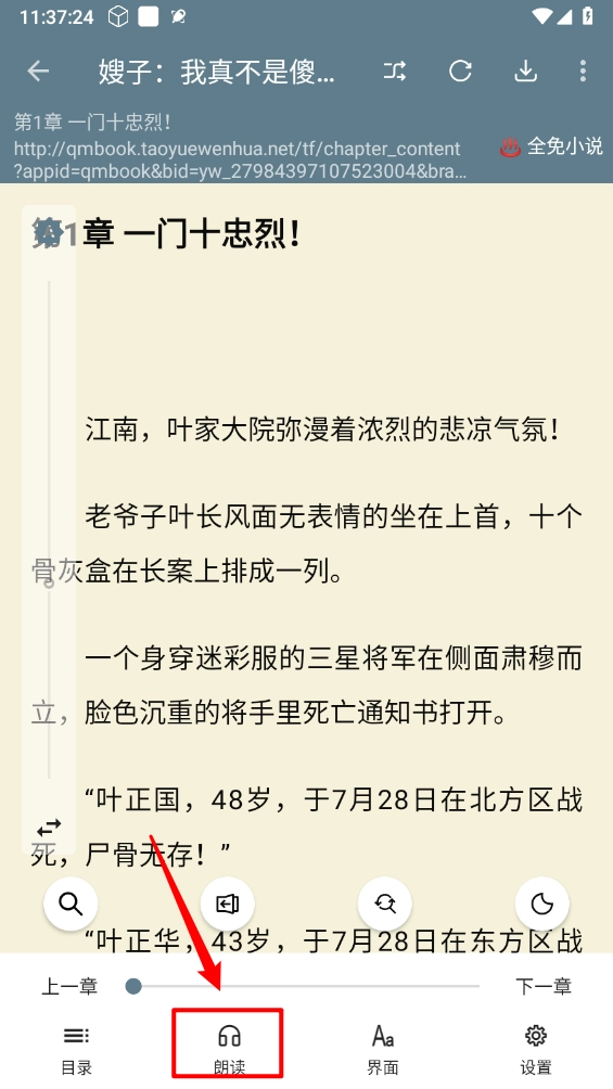 进入后点击中间区域呼出菜单,点击"朗读"。