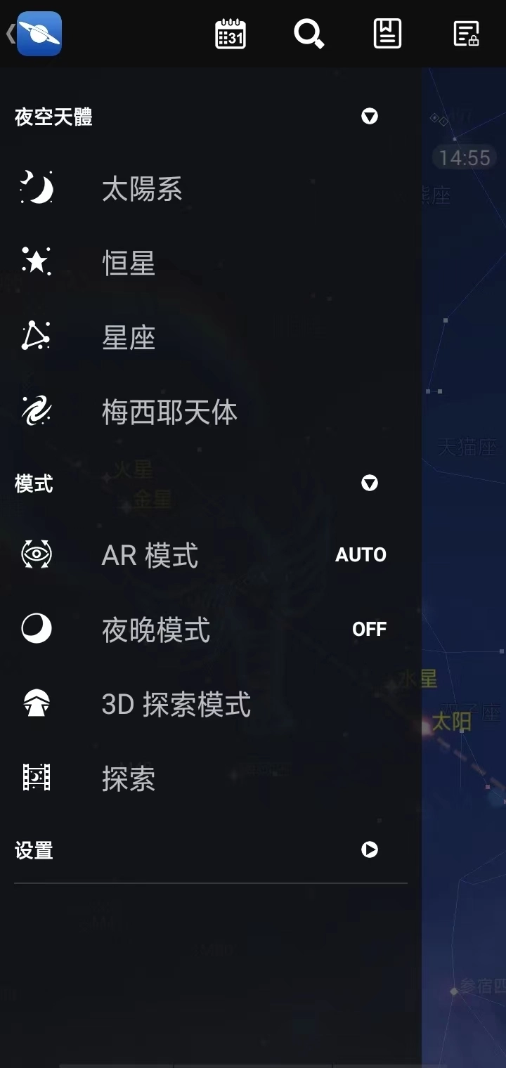 4、点击左上角的图标,既能查看夜空天体(如太阳系、恒星、星座、梅西耶天体等),也可以进行模式设置。