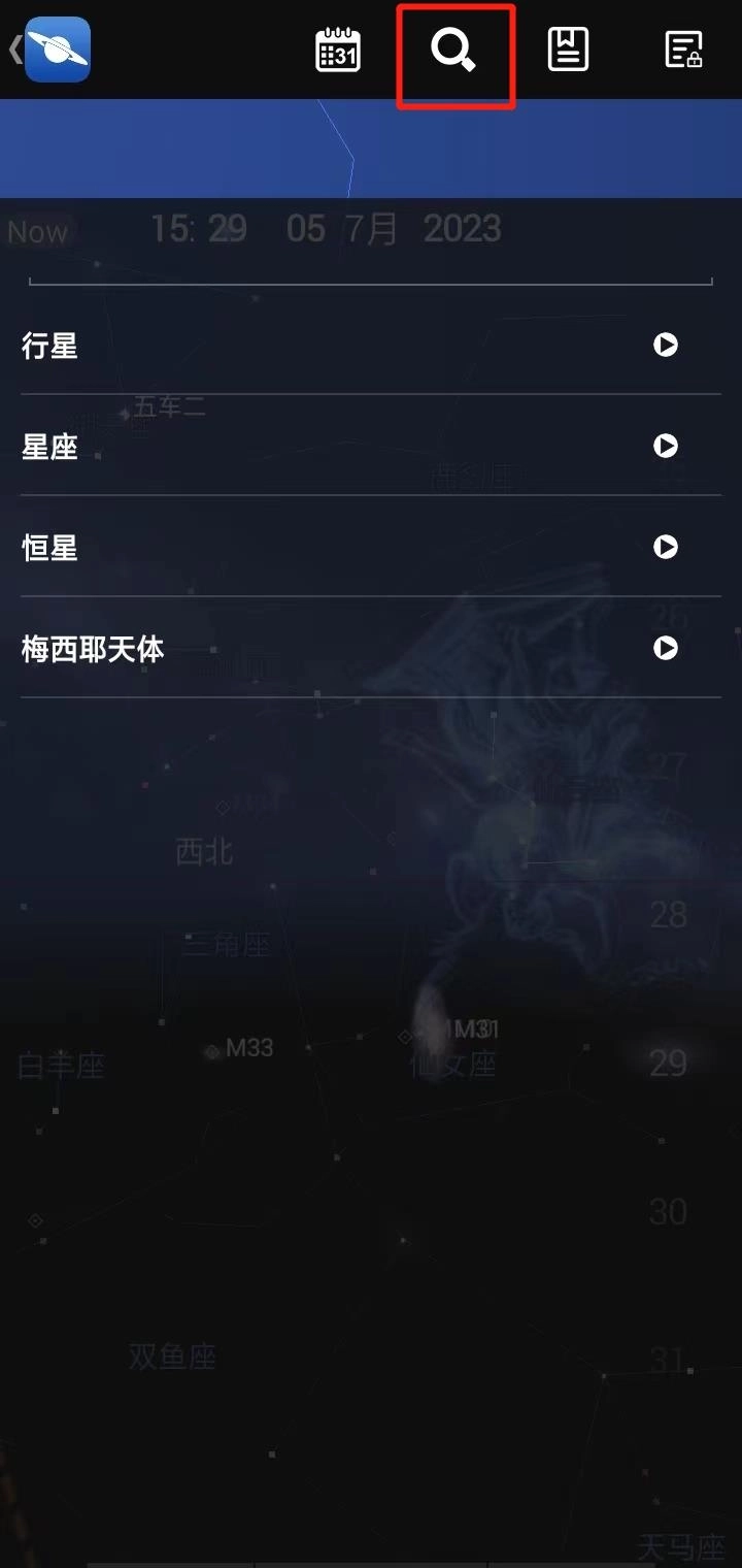 6、点击放大镜图标,就能搜索自己感兴趣的行星、星座之类的内容。