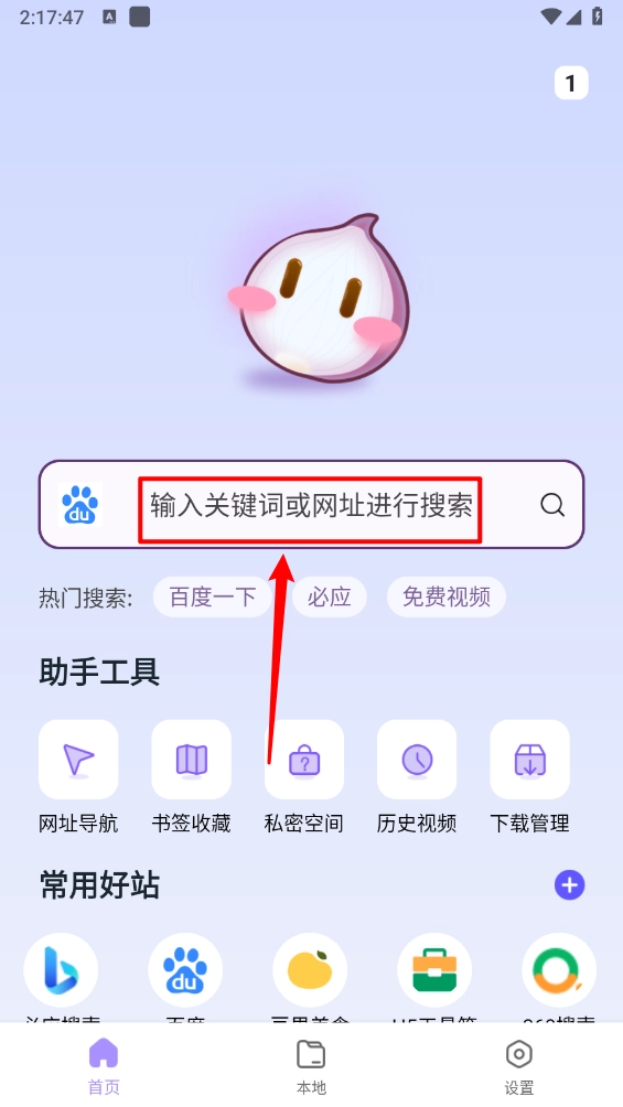 在首页点击顶部的搜索框,输入关键词或者网址就能进行搜索。