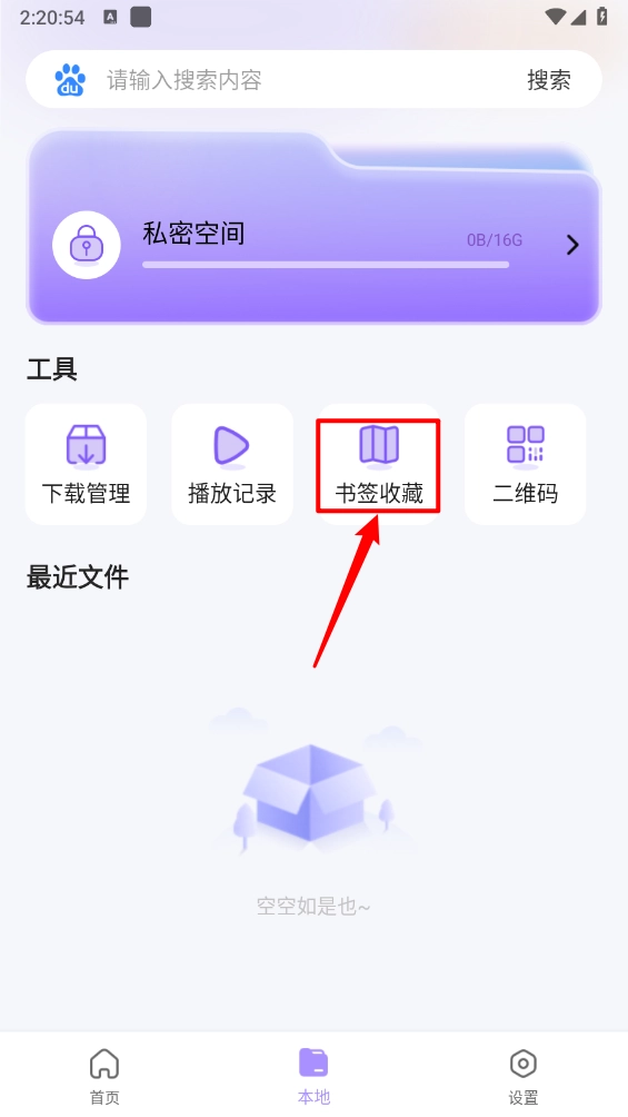 返回主页点击"本地"板块,选择"书签收藏"。