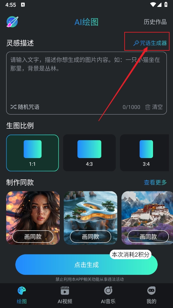 进入软件主页,点击"咒语生成器"。