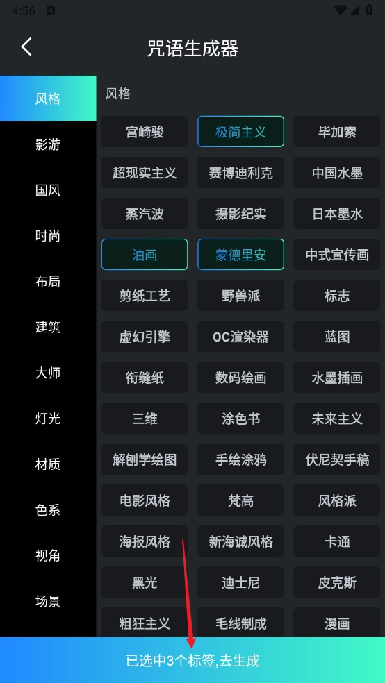 然后选择所需的标签,点击底部"去生成"。