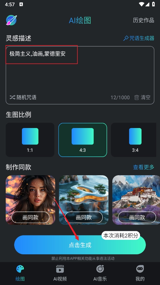 如图所示,已自动添加到灵感描述中,你可以选择比例、生成数量等参数,之后点击底部的生成按钮就可以了。