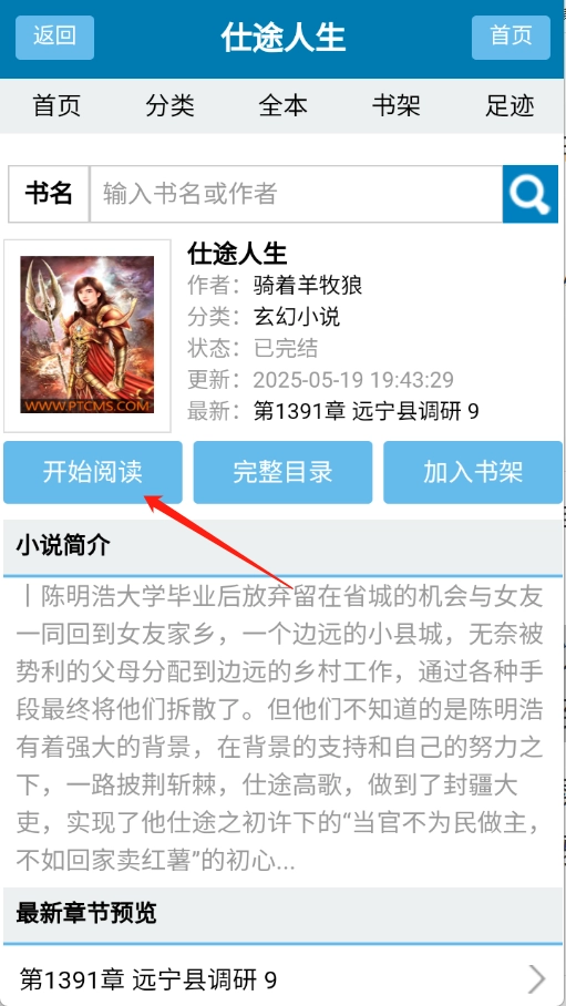 找到你想看的小说后点击进入详情页面,然后点击“开始阅读”按钮。