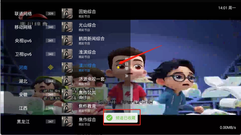 长按可以收藏电视频道。