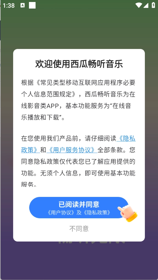 用户首先在3G游戏网的西瓜畅听中收听音乐,在此过程中查看并同意隐私政策与用户协议。