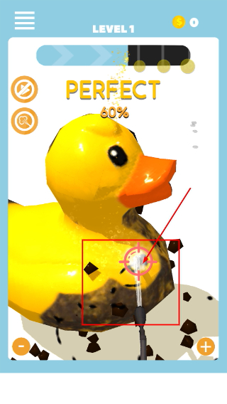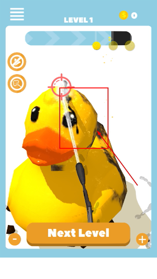 1、拿起【水枪】对准【小黄鸭】沾染污渍的部位进行喷射,一点点把脏污清理掉,慢慢推进清洁的进度,同时感受这个解压的过程。