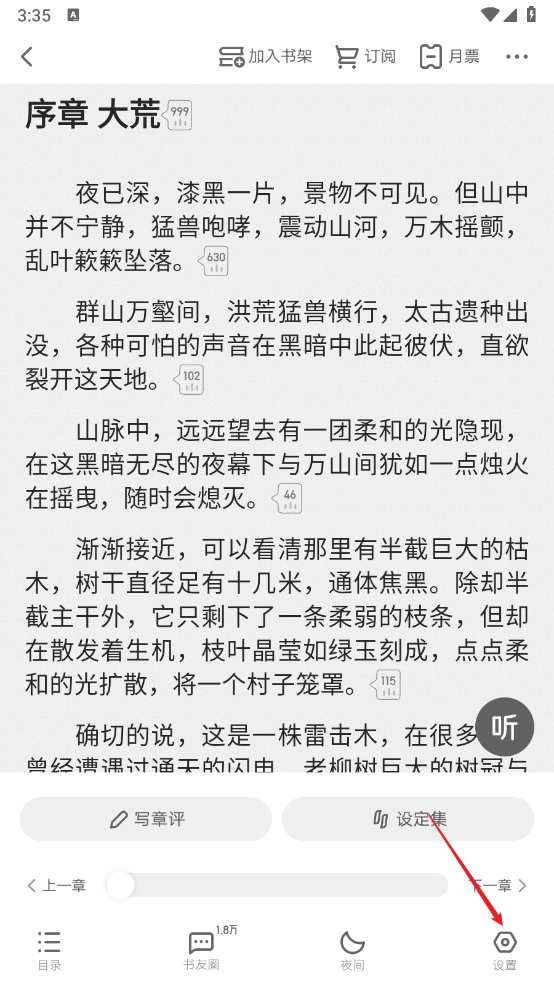 在阅读界面呼出菜单,点击右下角"设置"进入。