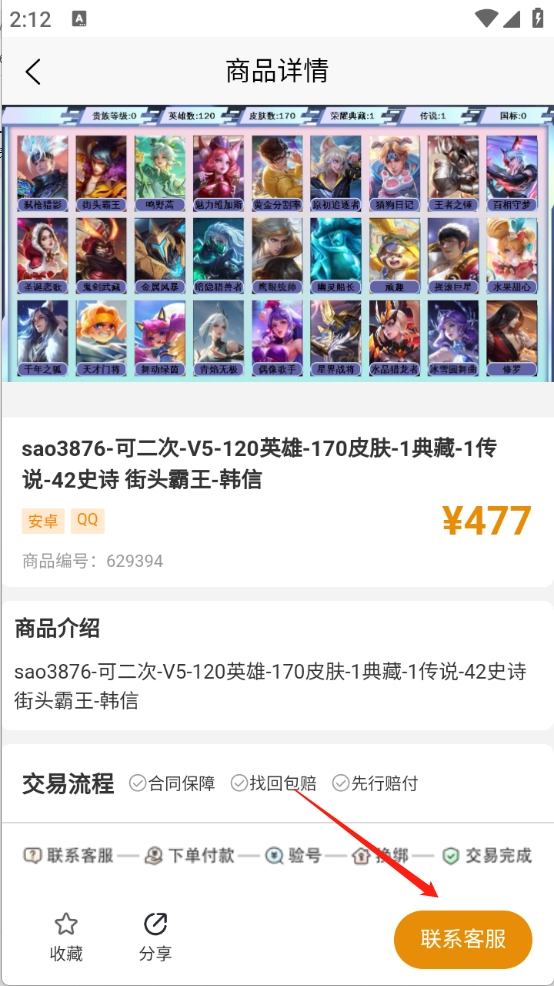 玩家找到想玩的游戏资源并点击进入后,可联系客服咨询买号相关事宜,也能对该资源进行收藏或分享操作。