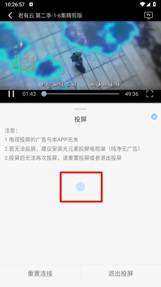 最后完成搜索并连接投屏设备后,就能开启投屏播放了,需要注意的是手机和投屏设备要处于同一个网络环境中。