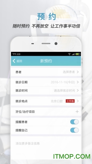 精细化预约服务:牙医在创建预约时,能够选定具体牙位并添加对应的治疗项目;预约确认后,系统会自动向患者和医生同步预约详情,且在诊疗当天推送提醒通知。