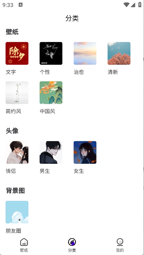 分类页面包含了各种头像、壁纸以及背景图等都有。