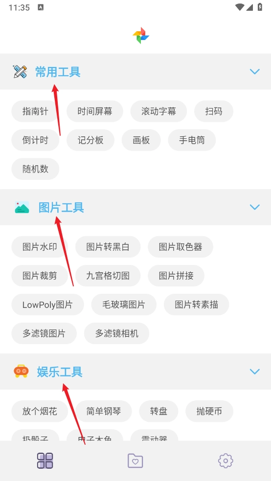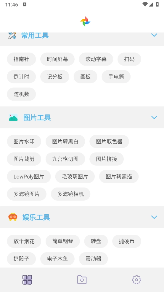 进入软件后,里面包含了常用工具、图片工具以及娱乐工具等类别,只需一键点击就能直接进入使用。