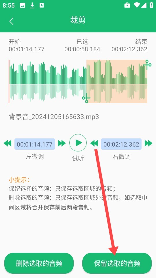 3、最后自定义调整需要保留的音频内容即可。