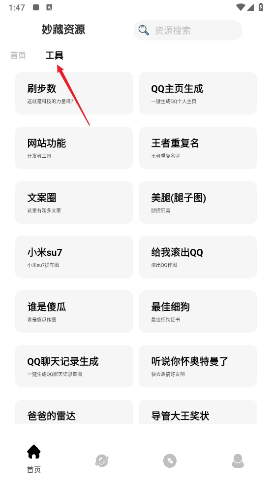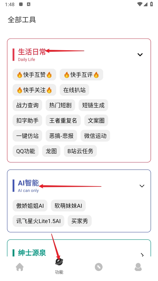 进入“功能”板块后,系统会对工具进行分类整理,你可以随时在该板块内挑选合适的工具来使用。