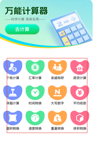 1、在万能计算器页面,选择【体脂计算】【个税计算】等功能选项,即可进入对应的计算界面。
