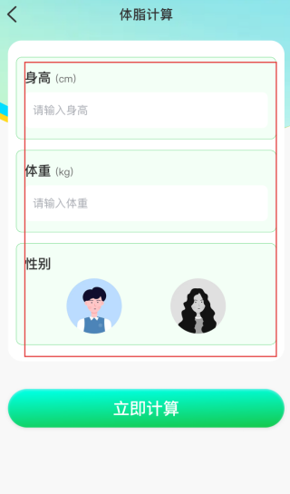 3、在体脂计算页面,依次输入身高、体重,选择对应的性别后,点击【立即计算】按钮。